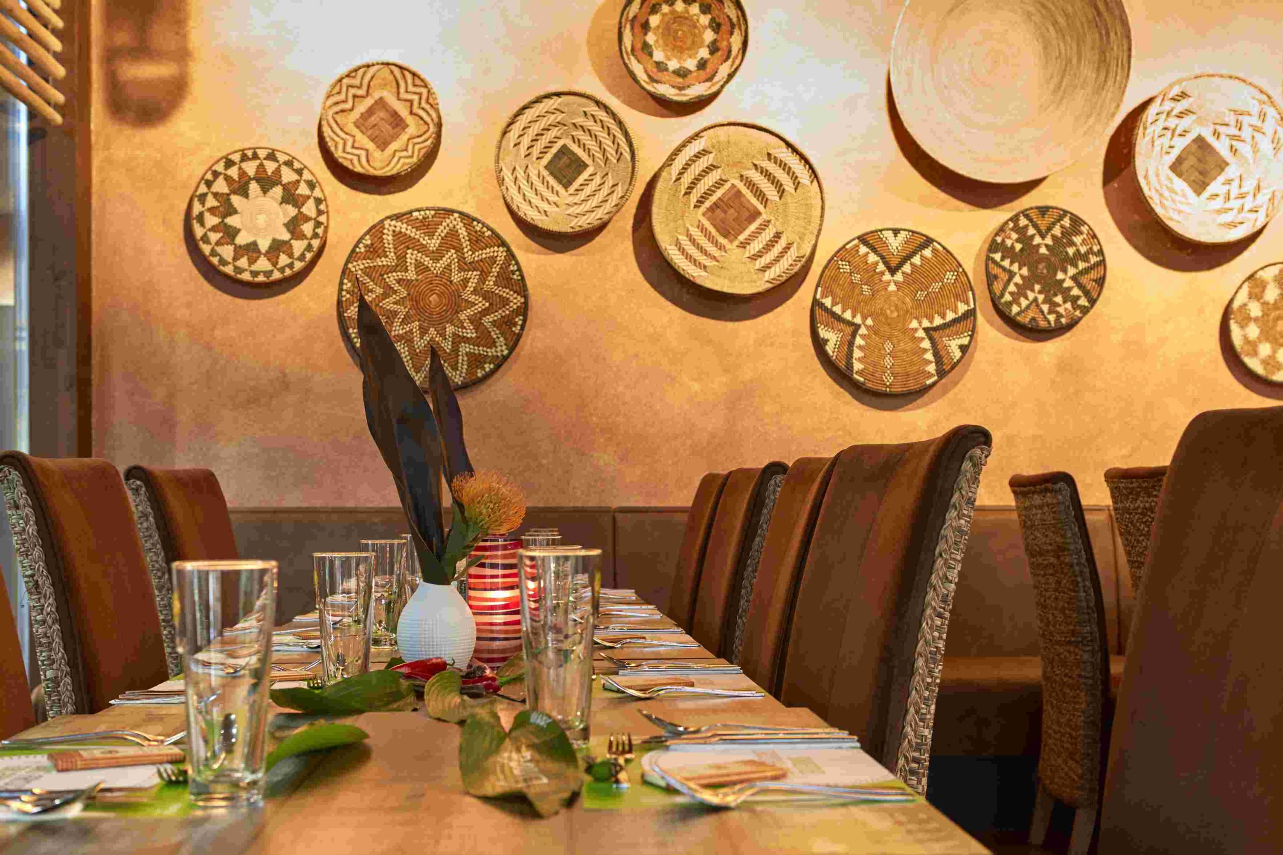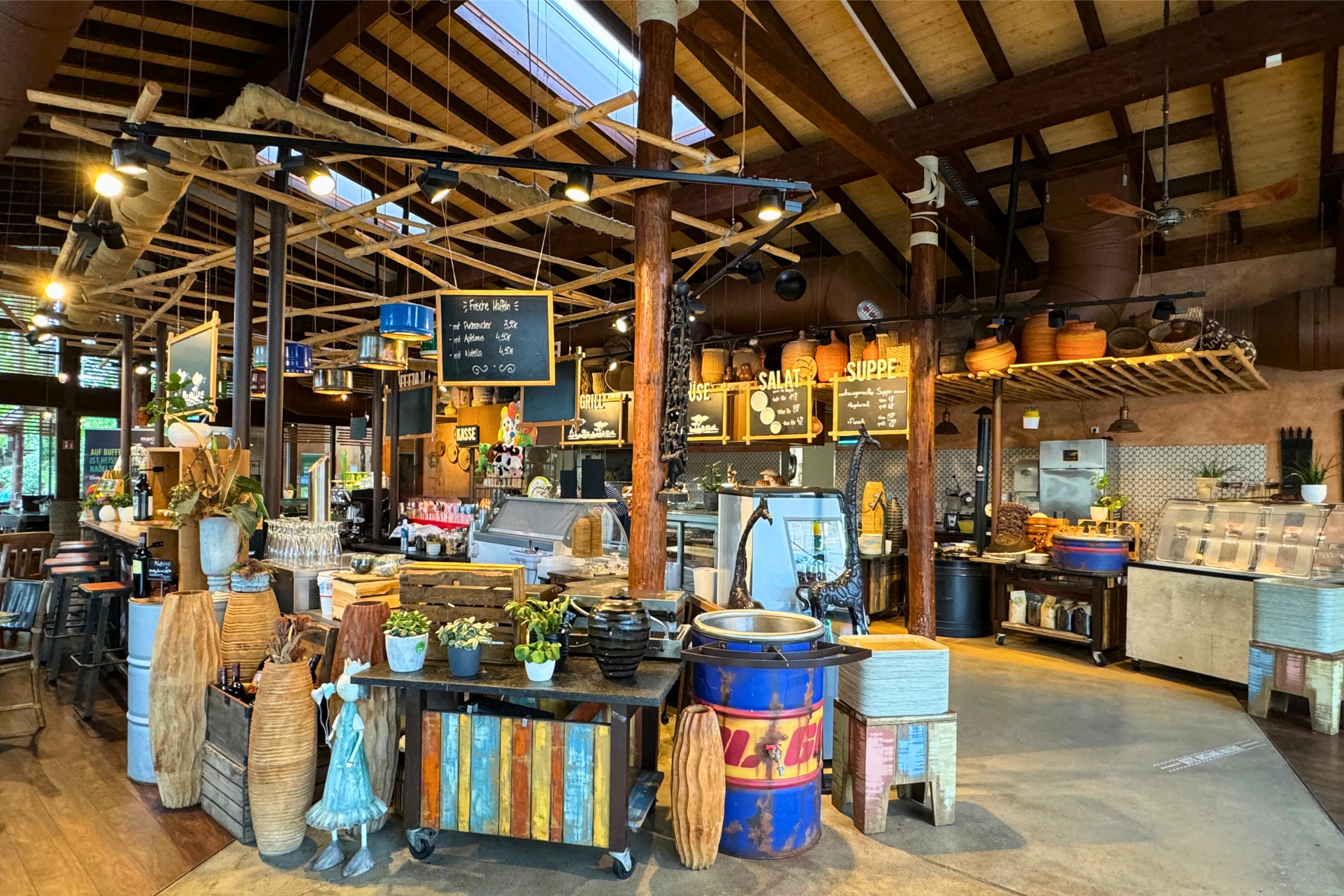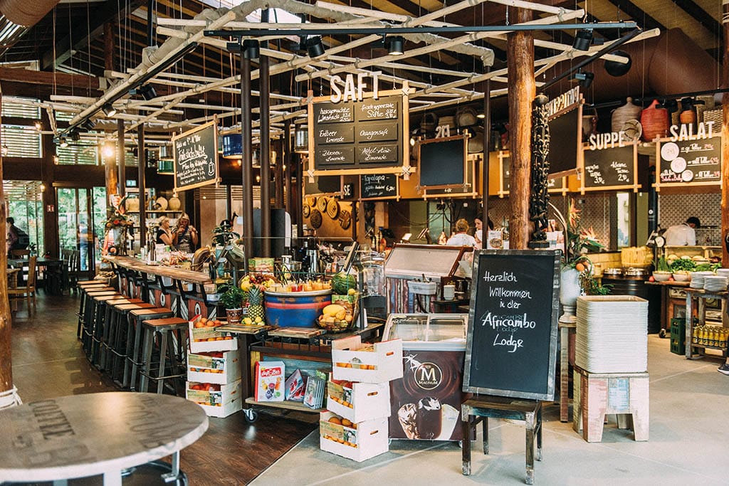 Frische, Saisonalität und Regionalität wird hier groß geschrieben. Ob beim gemütlichen Frühstück vor dem Zoobesuch, einem stärkenden Mittagsessen oder bei einer kurzen Kaffeepause – in der AFRICAMBO Lodge genießen Sie frisch zubereitete Gerichte aus der Küche Mama Afrika: afrikanische Grillspezialitäten, wie frisch marinierte Fleischspieße und gefüllte Fleischtaschen, Fladenbrote, Potje, Salatvariationen sowie Saftkreationen  – alles zu einem attraktiven Preis-/Leistungsverhältnis.