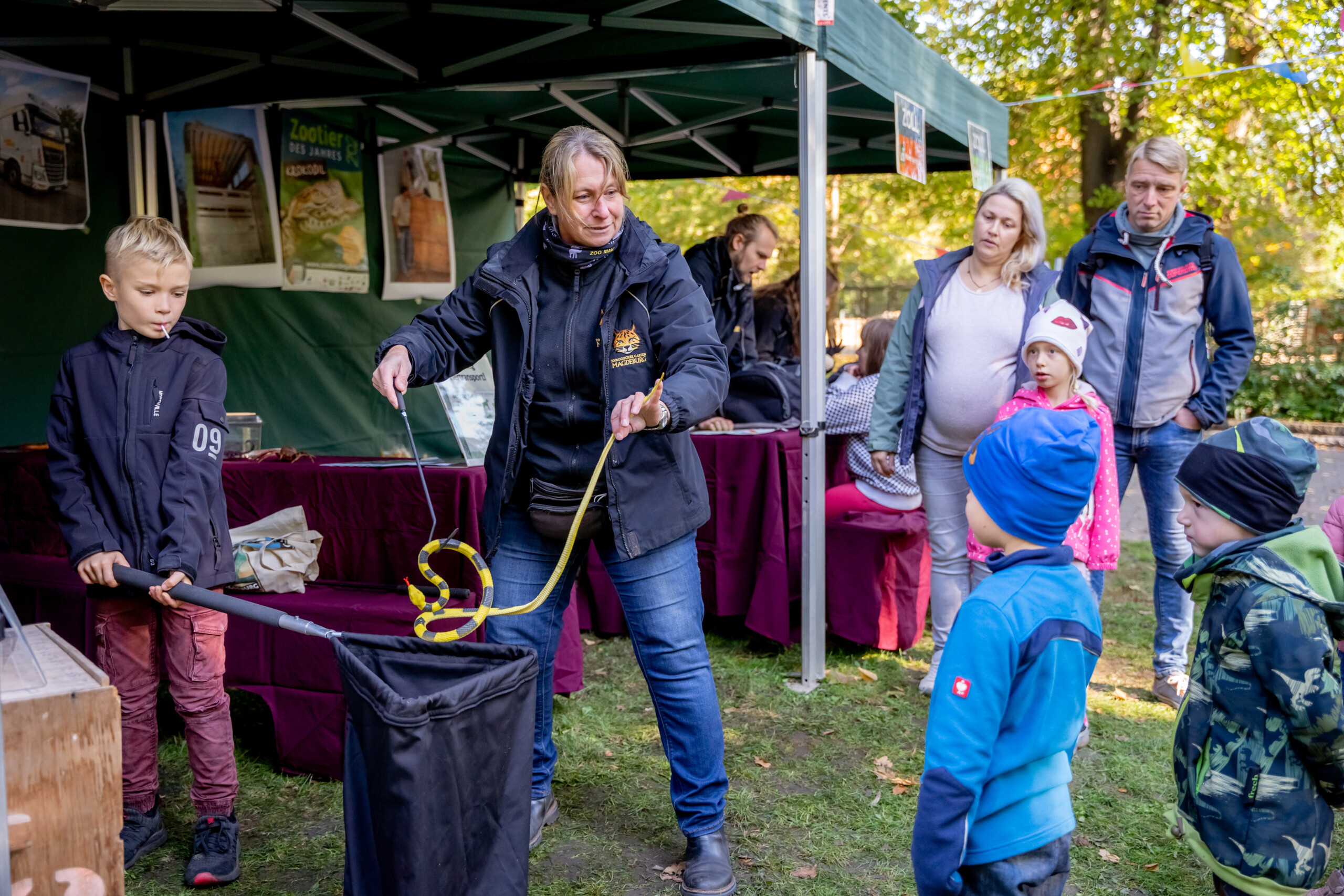 Diese spannenden Fragen werden von Zoopädogogen und Zoo-Auszubildenden an ihren Aktionsständen beantwortet – begleitet von vielen erstaunlichen Exponaten zum Anfassen. Am Zollstand erfahren Kinder, warum es verboten ist, Schildkrötenpanzer oder Elfenbein aus dem Urlaub mitzubringen, und können selbst Taschen nach illegalen Mitbringsel durchsuchen. Wie wird ein Schneeleopard oder eine Antilope transportiert und was ist dabei zu beachten? Die Zoopädagogen und Zoo-Guides halten hierzu viele Informationen und Anschauungsmaterial bereit. Die Zoo-Auszubildenden informieren zudem über die Ernährung der Zootiere und worauf man bei der Fütterung von Tigern, Erdmännchen und Co. achten muss.