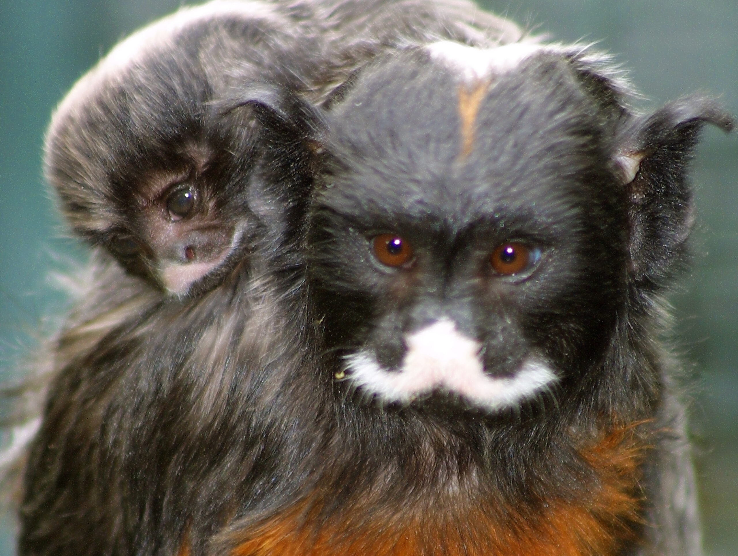 Rotbauchtamrin-Zwillinge sitzen im Fell des Vaters