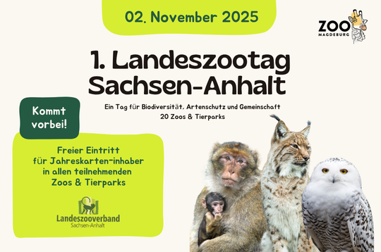 Der Landeszooverband Sachsen-Anhalt e.V. mit seinen 20 Mitgliedern führt den ersten Landeszootag Sachsen-Anhalt durch. Die teilnehmenden Mitgliedszoos bieten allen Zoo-Jahreskarten-Inhabern am 2. November 2025 die Chance, kostenfrei die Arbeit der teilnehmenden Zoos des Landeszooverbandes Sachsen-Anhalt näher kennenzulernen.