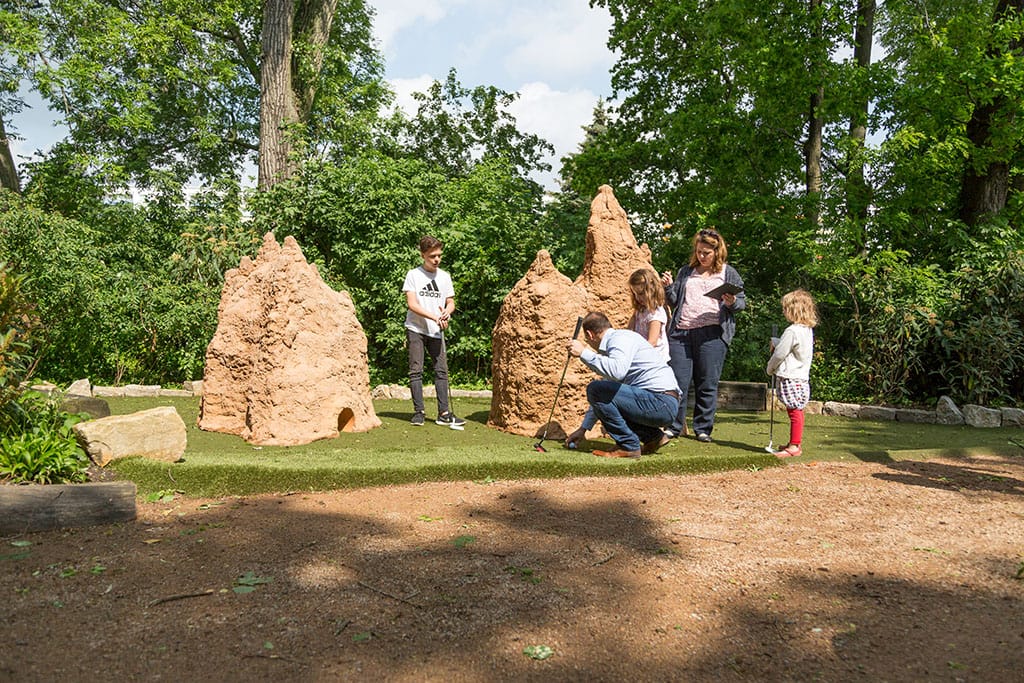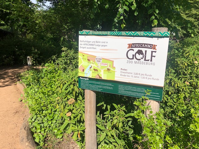 Das Sommerwetter lockt nach draußen – höchste Zeit, sich in der Natur auch mal wieder sportlich zu betätigen. Jetzt ist dies im Zoo mit einem hohen Spaßfaktor möglich: Auf der neuen Adventure Golfanlage, die sich unmittelbar neben der AFRICAMBO Lodge befindet, gibt es auf dem rund 1500 Quadratmeter großen Gelände jede Menge Herausforderungen. An den 9 themenhaften Golflöchern gilt es, bei den Schliefer-Klippen, dem Löwen-Versteck über den Pavian-Felsen bis hin zum Erdmännchen-Ausguck mit wenigen Golfschlägen geschickt den Golfball einzulochen.